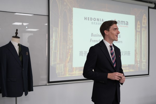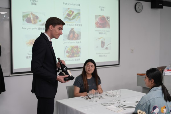 当天下午,《法式商务礼仪》课程在行业专家Matthieu Ventelon的生动讲解中拉开帷幕:从不同商务场合的着装规范,到法式晚宴的用餐礼仪,同学们通过角色扮演模拟各类场景,在实践中浸润式地学习法式商务礼仪,比较中法文化差异。