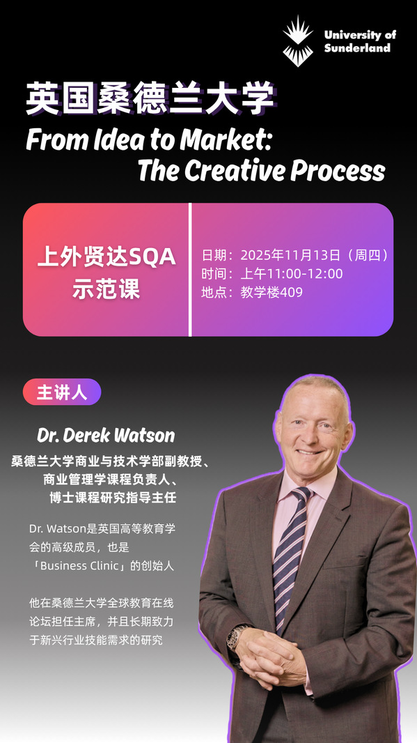 11月13日上午,英国桑德兰大学Dr. Derek Watson教授走进我校国际教育学院的课堂,为AD项目的学生带来题为“From Idea to Market: The Creative Process”的示范课程。通过此次现场教学,学生直观了解了英国高校的课堂特点,也获得了关于未来学习和职业规划的思考方向。