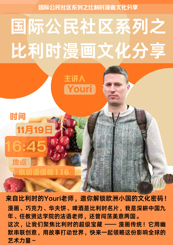 11月19日下午,我校国际交流合作处特邀比利时籍教师Youri,带来“解锁比利时文化密码——聚焦漫画传统”主题分享活动。活动现场座无虚席,师生在生动讲解中探寻比利时漫画的独特魅力。