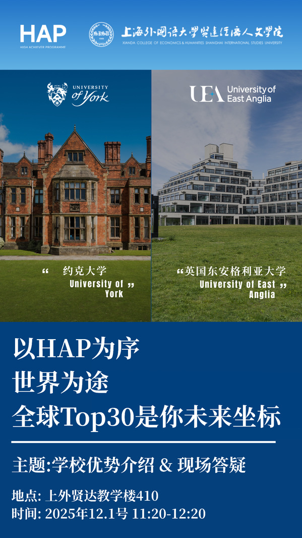12 月 1 日,英国约克大学、东安格利亚大学中国办老师为我校国际教育学院AD项目学生开展了一场内容丰富的赴英留学主题分享会,吸引了众多学生的关注。其中约克大学作为首次加入SAQ-AD 项目合作体系的院校,同时也是当前体系内全球排名最高的合作高校,其亮相与东安格利亚大学的深度解析形成双重亮点,吸引了众多学生到场参与,现场互动频繁、氛围热烈。