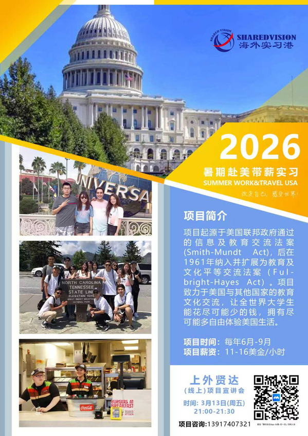 为了帮助同学们了解更多优质的短期项目,我们邀请我校美国合作方陈老师为我校学生举办一场2026赴美带薪实习线上宣讲会,具体安排如下: